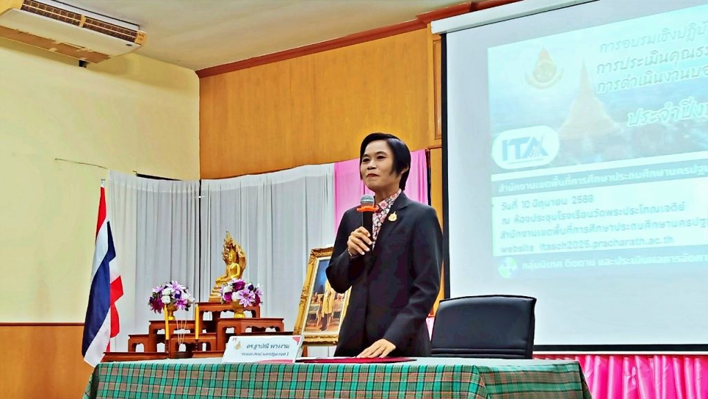วันอังคารที่ 10 มิถุนายน 2568 เวลา 09.00 น. ดร.ณัฎฐิกา ลิ้มเฉลิม ผู้อำนวยการสำนักงานเขตพื้นที่การศึกษาประถมศึกษานครปฐม เขต 1 มอบหมายให้ นางสาวฐาปณี พวงงาม รองผอ.สพป.นครปฐม เขต 1 เป็นประธานในพิธีเปิดการอบรมเชิงปฏิบัติการประเมินคุณธรรมและความโปร่งใสในการดำเนินงานของสถานศึกษาออนไลน์ (ITA) ประจำปีงบประมาณ 2568 โดยมี นางจรรยาพร ยอดแก้ว ผู้อำนวยการกลุ่มนิเทศติดตามและประเมินผลการจัดการศึกษา สพป.นครปฐม เขต 1 พร้อมกลุ่มนิเทศ ติดตามฯ ในนามของฝ่ายจัดการอบรมฯ กล่าวรายงาน มีวัตถุประสงค์ เพื่อส่งเสริมสนับสนุนการดำเนินงานโครงการเสริมสร้างคุณธรรม จริยธรรมและธรรมาภิบาลในสถานศึกษา (โครงการโรงเรียนสุจริต) เพื่อส่งเสริมสนับสนุนให้สถานศึกษาในสังกัด สพป.นครปฐม เขต 1 จำนวน 121 แห่ง ได้รับการประเมินคุณธรรมและความโปร่งใสในการดำเนินงานของสถานศึกษาออนไลน์ (ITA Online) ประจำปีงบประมาณ 2568 และเพื่อพัฒนาผู้เรียนด้านการเรียนรู้ตามหลักสูตรต้านทุจริตศึกษา กลุ่มเป้าหมายสถานศึกษาในสังกัด สพป.นครปฐม เขต 1 จำนวน 121 แห่ง ได้รับการประเมินคุณธรรมและความโปร่งใสในการดำเนินงานของสถานศึกษาออนไลน์ (ITA Online) ประจำปีงบประมาณ 2568 ทั้งนี้ได้รับการสนับสนุนงบประมาณจากสำนักงานคณะกรรมการการศึกษาขั้นพื้นฐาน การอบรมในครั้งนี้มีผู้เข้าร่วมฯ จำนวน 140 คน ณ ห้องประชุมทวารวดีศรีพระประโทน โรงเรียนวัดพระประโทณเจดีย์ อำเภอเมืองนครปฐม จังหวัดนครปฐม