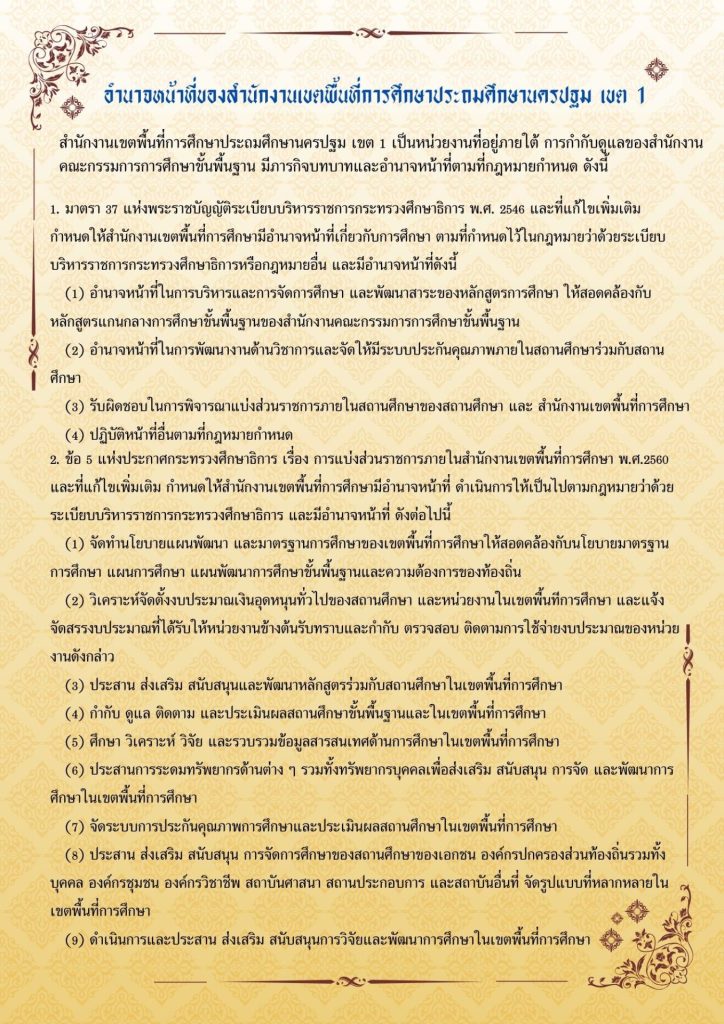 สำนักงานเขตพื้นที่การศึกษาประถมศึกษานครปฐม เขต 1 เป็นหน่วยงานที่อยู่ภายใต้ การกำกับดูแลของสำนักงานคณะกรรมการการศึกษาขั้นพื้นฐาน มีภารกิจบทบาทและอำนาจหน้าที่ ตามที่ กฎหมายกำหนด ดังนี้