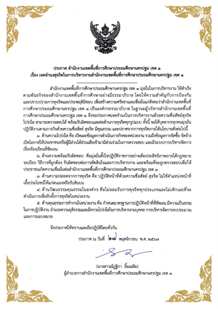 เจตจำนงสุจริตในการบริหารงานของ สพป.นครปฐม เขต 1