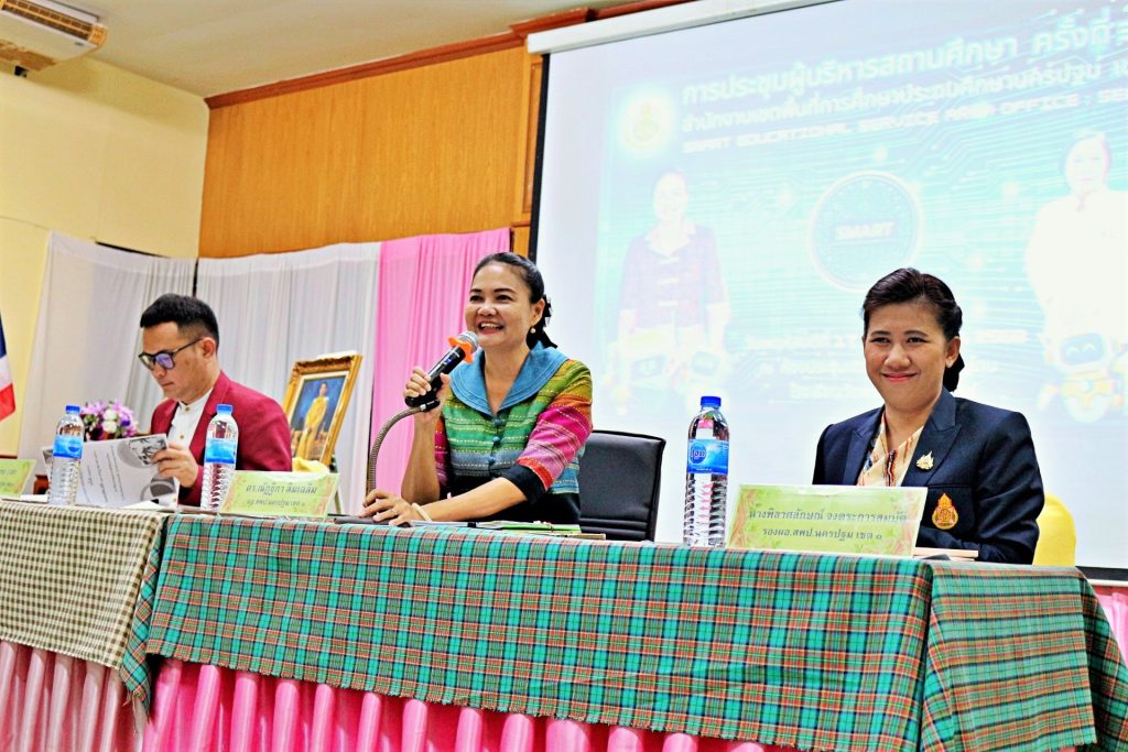 วันพฤหัสบดีที่ 17 กรกฎาคม 2568 เวลา 09.00 น. ดร.ณัฎฐิกา ลิ้มเฉลิม ผู้อำนวยการสำนักงานเขตพื้นที่การศึกษาประถมศึกษานครปฐม เขต 1 เป็นประธานดำเนินการประชุมผู้บริหารสถานศึกษา ในสังกัด สพป.นครปฐม เขต 1 ครั้งที่ 3/2568 พร้อมด้วย นางพิลาศลักษณ์ จงตระการสมบัติ และนายวีรยุทธ เวสา รองผู้อำนวยการสำนักงานเขตพื้นที่การศึกษาประถมศึกษานครปฐม เขต 1 เพื่อมอบนโยบายการบริหารการศึกษา พร้อมแจ้งข้อราชการสำคัญตามระเบียบวาระการประชุม และนำเสนอวิธีการใช้ระบบการเรียนรู้ออนไลน์ ผ่านช่องทางระบบ (Classroom Digital – NPT1) เรียนได้ ทุกที่ ทุกเวลา (Anywhere Anytime) สำหรับผู้บริหารสถานศึกษา ครู และนักเรียน ในสังกัด เพื่อเข้าใช้งาน โดยใช้ AI และเทคโนโลยีในการออกแบบกิจกรรมสื่อการเรียนการสอน และการจัดทำแบบทดสอบที่รู้ผลได้ทันที ช่วยลดภาระครู นักเรียน และผู้ปกครอง ในการนี้มี ผู้อำนวยการกลุ่ม/หน่วย ผู้บริหารสถานศึกษาจำนวน 121 คน และบุคลากรทางการศึกษา สังกัด สพป.นครปฐม เขต 1 เข้าร่วมการประชุมในครั้งนี้ ณ ห้องประชุมทวารวดีศรีพระประโทณ โรงเรียนวัดพระประโทณเจดีย์ อำเภอเมืองนครปฐม จังหวัดนครปฐม
