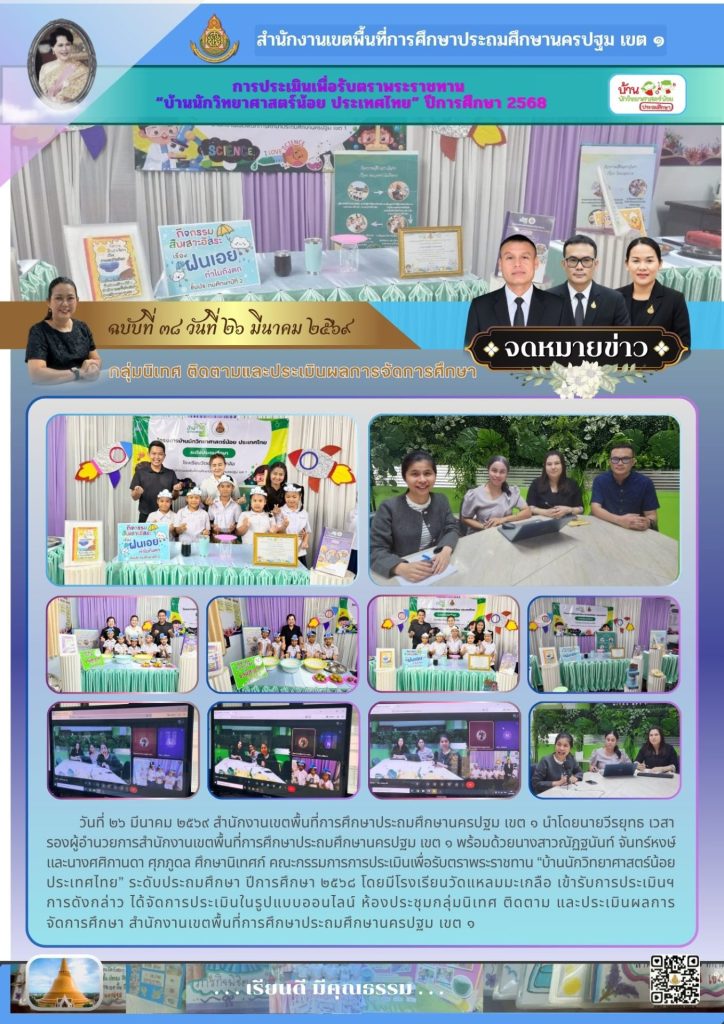 วันที่ ๒๖ มีนาคม ๒๕๖๙ สำนักงานเขตพื้นที่การศึกษาประถมศึกษานครปฐม เขต ๑ นำโดยนายวีรยุทธ เวสา รองผู้อำนวยการสำนักงานเขตพื้นที่การศึกษาประถมศึกษานครปฐม เขต ๑ พร้อมด้วยนางสาวณัฏฐนันท์ จันทร์หงษ์ และนางศศิกานดา ศุภภูดล ศึกษานิเทศก์ คณะกรรมการการประเมินเพื่อรับตราพระราชทาน “บ้านนักวิทยาศาสตร์น้อย ประเทศไทย” ระดับประถมศึกษา ปีการศึกษา ๒๕๖๘ โดยมีโรงเรียนวัดแหลมมะเกลือ เข้ารับการประเมินฯ การดังกล่าว ได้จัดการประเมินในรูปแบบออนไลน์ ห้องประชุมกลุ่มนิเทศ ติดตาม และประเมินผลการจัดการศึกษา สำนักงานเขตพื้นที่การศึกษาประถมศึกษานครปฐม เขต ๑
