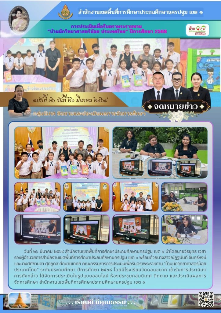 วันที่ ๒๖ มีนาคม ๒๕๖๙ สำนักงานเขตพื้นที่การศึกษาประถมศึกษานครปฐม เขต ๑ นำโดยนายวีรยุทธ เวสา รองผู้อำนวยการสำนักงานเขตพื้นที่การศึกษาประถมศึกษานครปฐม เขต ๑ พร้อมด้วยนางสาวณัฏฐนันท์ จันทร์หงษ์ และนางศศิกานดา ศุภภูดล ศึกษานิเทศก์ คณะกรรมการการประเมินเพื่อรับตราพระราชทาน “บ้านนักวิทยาศาสตร์น้อย ประเทศไทย” ระดับประถมศึกษา ปีการศึกษา ๒๕๖๘ โดยมีโรงเรียนวัดดอนขนาก เข้ารับการประเมินฯ การดังกล่าว ได้จัดการประเมินในรูปแบบออนไลน์ ห้องประชุมกลุ่มนิเทศ ติดตาม และประเมินผลการจัดการศึกษา สำนักงานเขตพื้นที่การศึกษาประถมศึกษานครปฐม เขต ๑