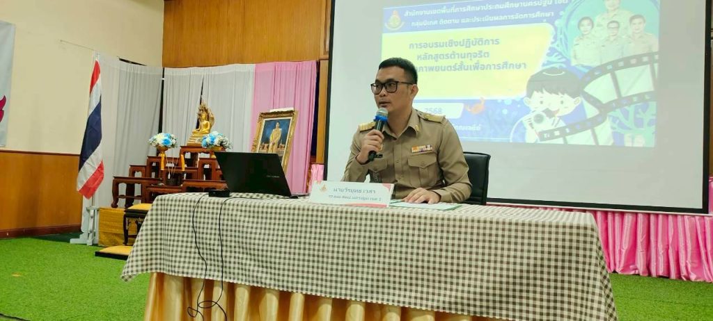 วันจันทร์ที่ 18 สิงหาคม 2568 เวลา 9.00 น. นายวีรยุทธ เวสา รองผู้อำนวยการสำนักงานเขตพื้นที่การศึกษาประถมศึกษานครปฐม เขต 1 พร้อมด้วย นางจรรยาพร ยอดแก้ว ผู้อำนวยการกลุ่มนิเทศติดตามและประเมินผลการจัดการศึกษา สพป.นครปฐม เขต 1 และคณะศึกษานิเทศก์ ได้จัดกิจกรรมการอบรมเชิงปฏิบัติการหลักสูตรต้านทุจริตการจัดทำภาพยนตร์สั้นเพื่อการศึกษา โดยมีกลุ่มเป้าหมาย ผู้บริหาร คุณครูในสถานศึกษาในสังกัด จำนวน 121 แห่ง ซึ่งมีวัตถุประสงค์เพื่อสร้างความเข้าใจในการเพิ่มเทคนิควิธีการสร้างประสบการณ์ใหม่ ที่ใช้ในการจัดทำสื่อการเรียนการสอน สื่อประชาสัมพันธ์และอื่นๆ ที่จะเป็นประโยชน์ต่อสถานศึกษาและเพื่อให้ผู้บริหารและครูสามารถนำความรู้และประสบการณ์ที่ได้รับจากอบรมนำไปใช้เพื่อส่งเสริมสนับสนุนสถานศึกษาต่อไป