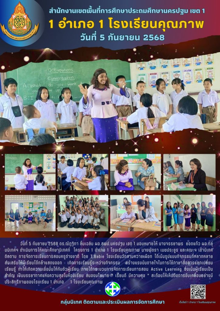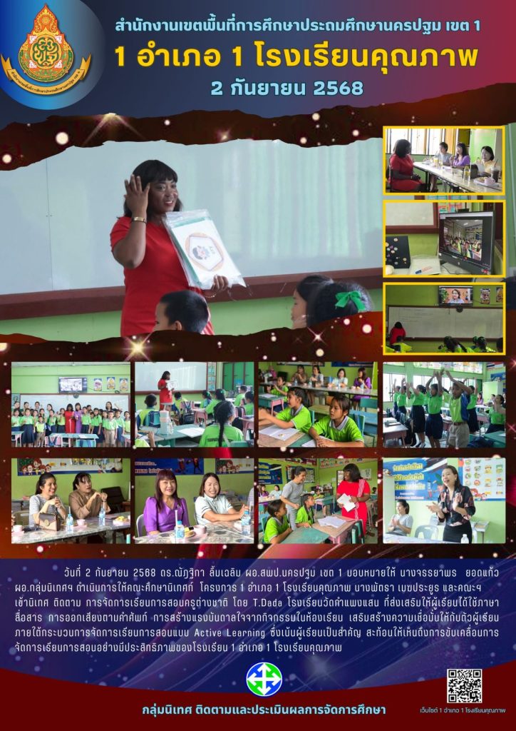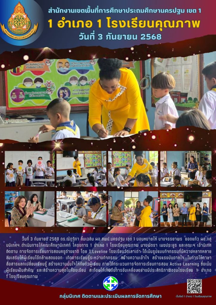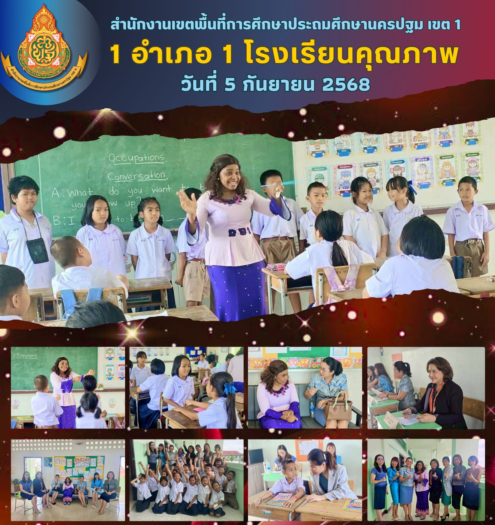 นางสาวณัฏฐิกา ลิ้มเฉลิม ผอ. สพป. นครปฐมเขต 1 มอบหมายให้ นางจรรยาพร ยอดแก้ว ผอ. กลุ่มนิเทศ ติดตาม ฯ ดำเนินการให้คณะศึกษานิเทศก์ นำโดย นางพัตรา เมฆประยูร ศึกษานิเทศก์ สพป. นครปฐม เขต 1 และ คณะฯ ร่วมขับเคลื่อนกิจกรรมสะท้อนคุณภาพสถานศึกษาของโรงเรียนในโครงการ 1 อำเภอ 1 โรงเรียนคุณภาพ ตั้งแต่วันที่ 2 กันยายน ถึง วันที่ 5 กันยายน 2568 โดยผู้บริหารและคณะครูในโครงการ 1 อำเภอ 1 โรงเรียนคุณภาพ ในสังกัด สพป.นครปฐม เขต 1 ได้นิเทศ ติดตาม การจัดการเรียนการสอนโดยครูต่างชาติ ในวันที่ 2 กันยายน 2568 T.Dada โรงเรียนวัดกำแพงแสน (สว่างวิทยาคาร) วันที่ 3 กันยายน 2568 T.Loveline โรงเรียนวัดเลาเต่า และในวันที่ 5 กันยายน 2568 T.Babie โรงเรียนวัดสามควายเผือก โดยเน้นรูปแบบกิจกรรมที่มีความหลากหลาย ส่งเสริมให้ผู้เรียนได้กล้าแสดงออก เกิดการเรียบรู้ระหว่างกิจกรรม สร้างความเข้าใจ สร้างแรงบันดาลใจในการใช้ภาษา สื่อสารแลกเปลี่ยนเรียนรู้ การออกเสียงตามคำศัพท์ การสร้างความมั่นใจให้กับตัวผู้เรียน ภายใต้กระบวนการจัดการเรียนการสอบ Active Learning ซึ่งเน้นผู้เรียนเป็นสำคัญและสร้างความสุขในห้องเรียน สะท้อนให้เห็นถึงการขับเคลื่อนอย่างมีประสิทธิภาพของโรงเรียบ 1 อำเภอ1 โรงเรียนคุณภาพ