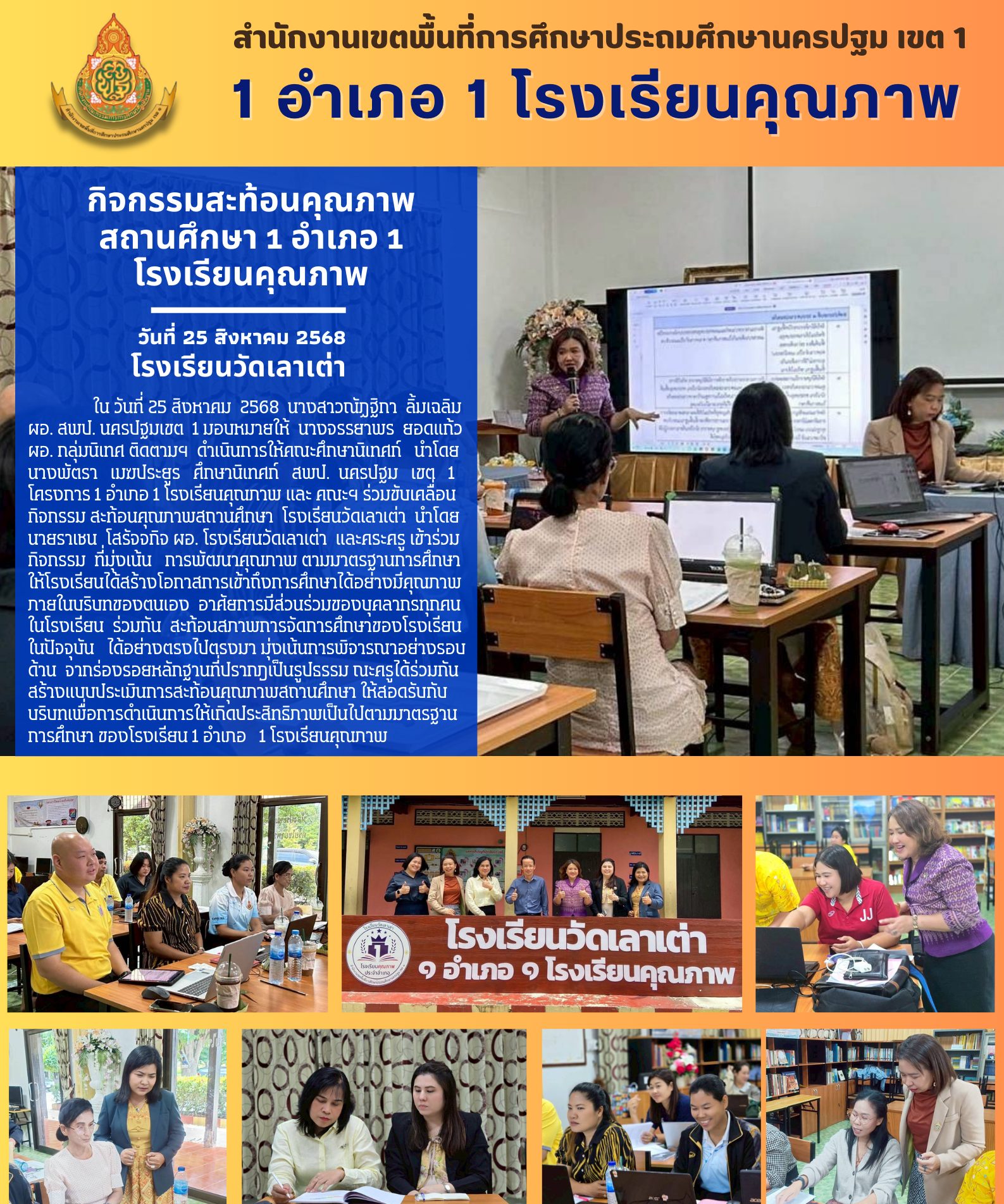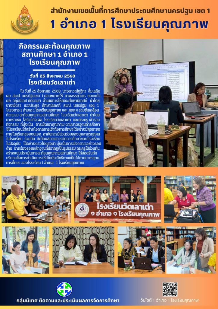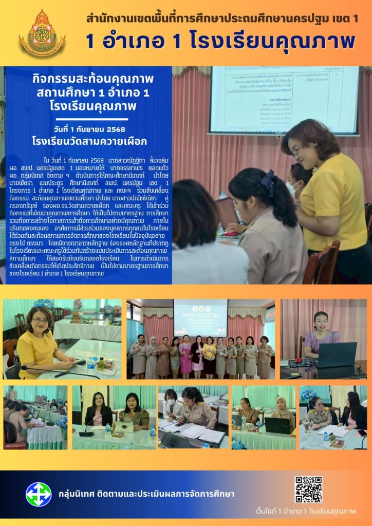 นางสาวณัฏฐิกา ลิ้มเฉลิม ผอ. สพป. นครปฐมเขต 1 มอบหมายให้ นางจรรยาพร ยอดแก้ว ผอ. กลุ่มนิเทศ ติดตาม ฯ ดำเนินการให้คณะศึกษานิเทศก์ นำโดย นางพัตรา เมฆประยูร ศึกษานิเทศก์ สพป. นครปฐม เขต 1 และคณะฯ ร่วมขับเคลื่อนกิจกรรมสะท้อนคุณภาพสถานศึกษาของโรงเรียนในโครงการ 1 อำเภอ 1 โรงเรียนคุณภาพ ตั้งแต่วันที่ 21 สิงหาคม ถึง วันที่ 1 กันยายน 2568 โดยผู้บริหารและคณะครูในโครงการ 1 อำเภอ 1 โรงเรียนคุณภาพ ในสังกัด สพป.นครปฐม เขต 1 โดยมีโรงเรียนวัดกำแพงแสน (สว่างวิทยาคาร) ในวันที่ 21 สิงหาคม 2568 โรงเรียนวัดเลาเต่า ในวันที่ 25 สิงหาคม 2568 และ โรงเรียนวัดสามควายเผือก ในวันที่ 1 กันยายน 2568 ภายในกิจกรรมเน้นการพัฒนาคุณภาพการศึกษาให้เป็นไปตามมาตรฐาน การศึกษารวมถึงการสร้างโอกาสการเข้าถึงการศึกษาอย่างมีคุณภาพ ภายใต้บริบทของโรงเรียนตนเอง อาศัยการมีส่วนร่วมของบุคลากรทุกคนในโรงเรียน ได้ร่วมกันสะท้อนสภาพการจัดการศึกษาของโรงเรียนในปัจจุบันอย่างตรงไปตรงมา โดยพิจารณาจากร่องรอยหลักฐานที่ปรากฎเป็นรูปธรรมในโรงเรียน พร้อมด้วยคณะครูร่วมกันสร้างแบบประเมินการสะท้อนคุณภาพสถานศึกษาให้สอดรับกับบริบทของโรงเรียน เพื่อให้การดำเนินการขับเคลื่อนกิจกรรม เกิดประสิทธิภาพ เป็นไปตามมาตรฐานการศึกษาของโรงเรียน 1 อำเภอ 1 โรงเรียนคุณภาพ ภายใต้กรอบนโยบายของกระทรวงศึกษาธิการ