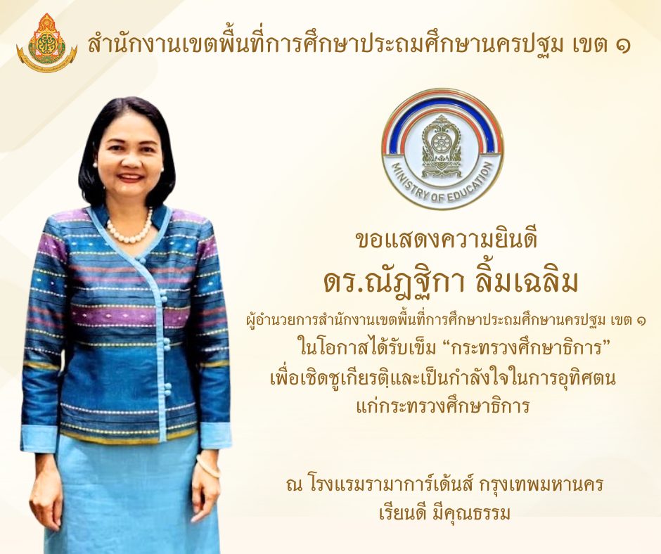สำนักงานเขตพื้นที่การศึกษาประถมศึกษานครปฐม เขต 1 ขอแสดงความยินดีกับ ดร.ณัฎฐิกา ลิ้มเฉลิม ผู้อำนวยการสำนักงานเขตพื้นที่การศึกษาประถมศึกษานครปฐม เขต 1 ในโอกาสได้รับเข็ม “กระทรวงศึกษาธิการ” เพื่อเป็นการเชิดชูเกียรติ ความภาคภูมิใจในการอุทิศตนต่อวงการศึกษาและกระทรวงศึกษาธิการ ในการประชุมสัมมนาผู้อำนวยการสำนักงานเขตพื้นที่การศึกษา ทั่วประเทศ ครั้งที่ 1/2568 ณ โรงแรมรามาการ์เด้นส์ กรุงเทพมหานคร
