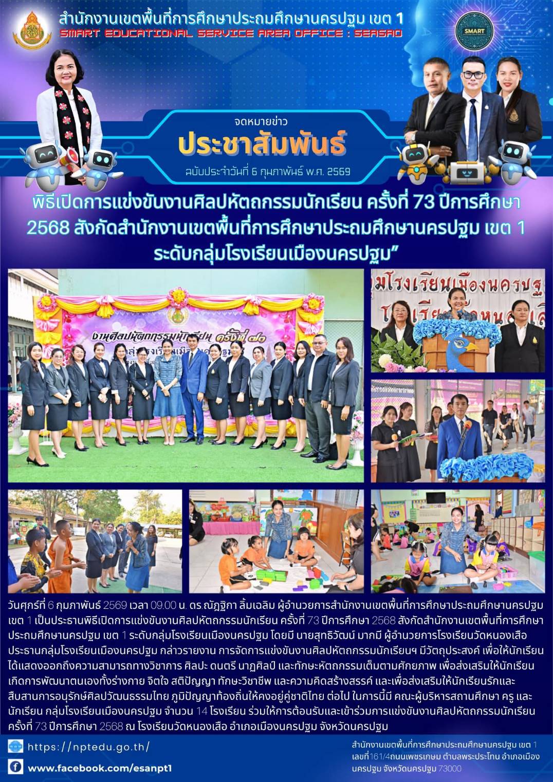 วันศุกร์ที่ 6 กุมภาพันธ์ 2569 ดร.ณัฎฐิกา ลิ้มเฉลิม ผู้อำนวยการสำนักงานเขตพื้นที่การศึกษาประถมศึกษานครปฐม เขต 1 เป็นประธานพิธีเปิดการแข่งขันงานศิลปหัตถกรรมนักเรียน ครั้งที่ 73 ปีการศึกษา 2568 สังกัดสำนักงานเขตพื้นที่การศึกษาประถมศึกษานครปฐม เขต 1 ระดับกลุ่มโรงเรียนเมืองนครปฐม โดยมี นายสุทธิวัฒน์ มากมี ผู้อำนวยการโรงเรียนวัดหนองเสือ ประธานกลุ่มโรงเรียนเมืองนครปฐม กล่าวรายงาน การจัดการแข่งขันงานศิลปหัตถกรรมนักเรียนฯ มีวัตถุประสงค์ เพื่อให้นักเรียนได้แสดงออกถึงความสามารถทางวิชาการ ศิลปะ ดนตรี นาฏศิลป์ และทักษะหัตถกรรมเต็มตามศักยภาพ เพื่อส่งเสริมให้นักเรียนเกิดการพัฒนาตนเองทั้งร่างกาย จิตใจ สติปัญญา ทักษะวิชาชีพ และความคิดสร้างสรรค์ และเพื่อส่งเสริมให้นักเรียนรักและสืบสานการอนุรักษ์ศิลปวัฒนธรรมไทย ภูมิปัญญาท้องถิ่นให้คงอยู่คู่ชาติไทย ต่อไป ในการนี้มี คณะผู้บริหารสถานศึกษา ครู และนักเรียน กลุ่มโรงเรียนเมืองนครปฐม จำนวน 14 โรงเรียน ร่วมให้การต้อนรับและเข้าร่วมการแข่งขันงานศิลปหัตถกรรมนักเรียน ครั้งที่ 73 ปีการศึกษา 2568 ระดับกลุ่มโรงเรียนเมืองนครปฐม ณ โรงเรียนวัดหนองเสือ อำเภอเมืองนครปฐม จังหวัดนครปฐม