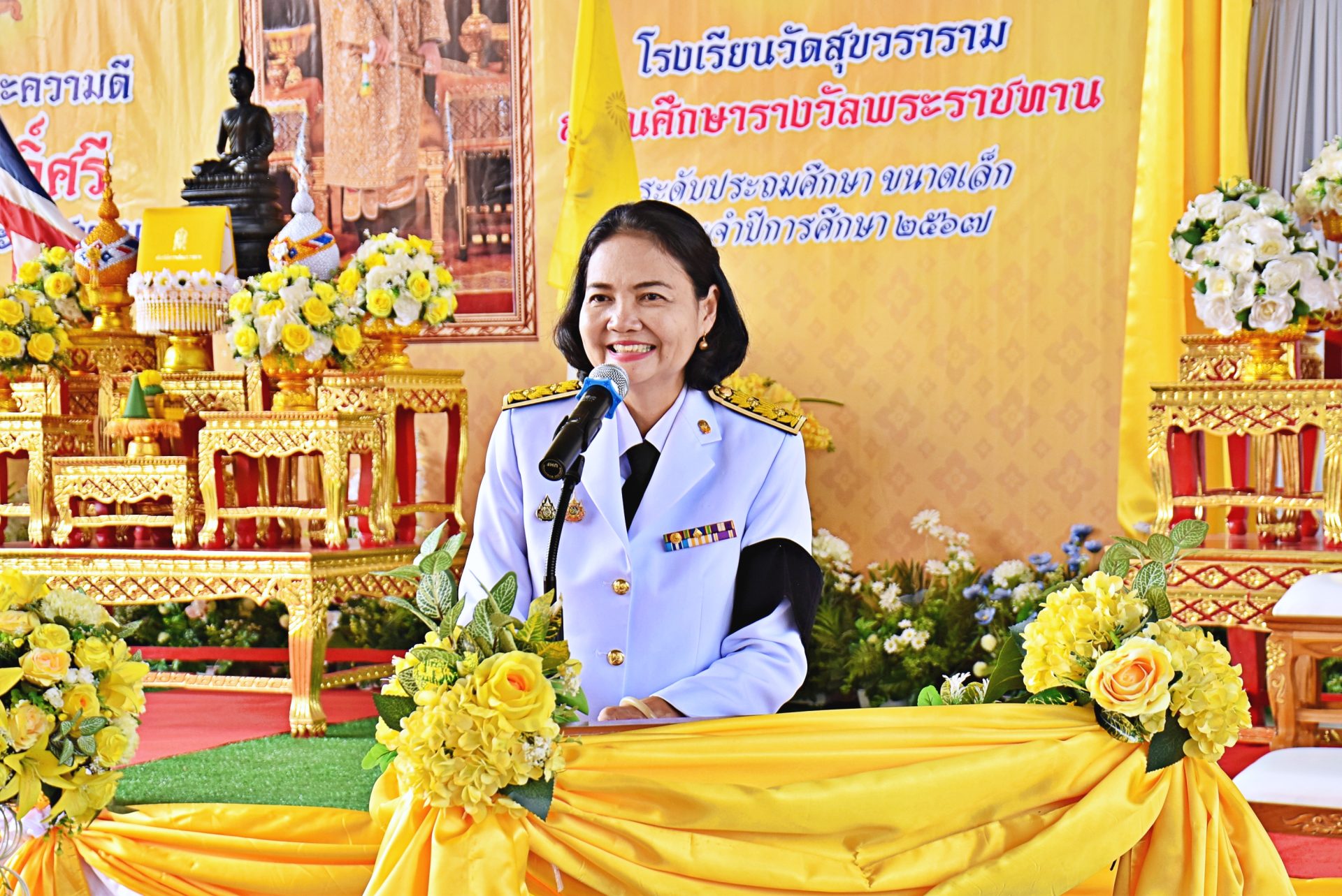 ในโอกาสนี้ ดร.ณัฎฐิกา ลิ้มเฉลิม ผู้อำนวยการสำนักงานเขตพื้นที่การศึกษาประถมศึกษานครปฐม เขต 1 กล่าว ขอแสดงความยินดีอย่างยิ่งกับโรงเรียนวัดสุขวรารามที่ได้รับรางวัล สถานศึกษารางวัลพระราชทานระดับประถมศึกษา ขนาดเล็ก ประจำปีการศึกษา ๒๕๖๗ รางวัลพระราชทานนี้ คือเกียรติยศสูงสุดที่สะท้อนให้เห็นถึงความมุ่งมั่น ตั้งใจ และการบริหารจัดการที่เป็นเลิศ แม้จะเป็นโรงเรียนขนาดเล็ก แต่ท่านได้พิสูจให้เห็นแล้วว่า “คุณภาพ” ไม่ได้ขึ้นอยู่กับขนาด แต่ขึ้นอยู่กับหัวใจของครู ความร่วมมือของชุมชน และศักยภาพของนักเรียน ประการต่อมาการเปิด “อาคารพระครูปฐมสิทธิชัย” ในวันนี้ นับเป็นนิมิตหมายอันดี อาคารแห่งนี้ไม่ได้เป็นเพียงสิ่งก่อสร้างด้วยอิฐหรือปูน แต่เป็นพื้นที่แห่งโอกาสที่จะบ่มเพาะเยาวชนให้เติบโตอย่างมีคุณภาพ ภายใต้อัตลักษณ์และเมตตาธรรมที่ท่านพระครูได้เมตตาอนุเคราะห์ไว้ ซึ่งเป็นอนุสรณ์แห่งความดีงามต่อไป และในวาระครบรอบ ๘๙ ปี ของการก่อตั้งโรงเรียน ขอชื่นชมในความหนักแน่นมั่นคงของสถานศึกษาแห่งนี้ ที่ยืนหยัดสร้างปัญญาให้แก่สังคมมาเกือบ ๑ ศตวรรษ ความสำเร็จในวันนี้จะเกิดขึ้นไม่ได้เลยหากขาดความสามัคคี และการสนับสนุนจากทุกภาคส่วน ทั้งคณะกรรมการสถานศึกษา ศิษย์เก่า และชุมชนที่เข็มแข็ง