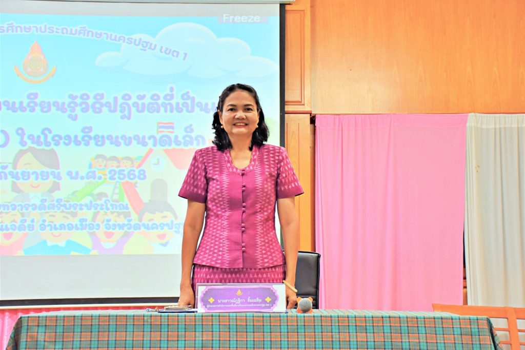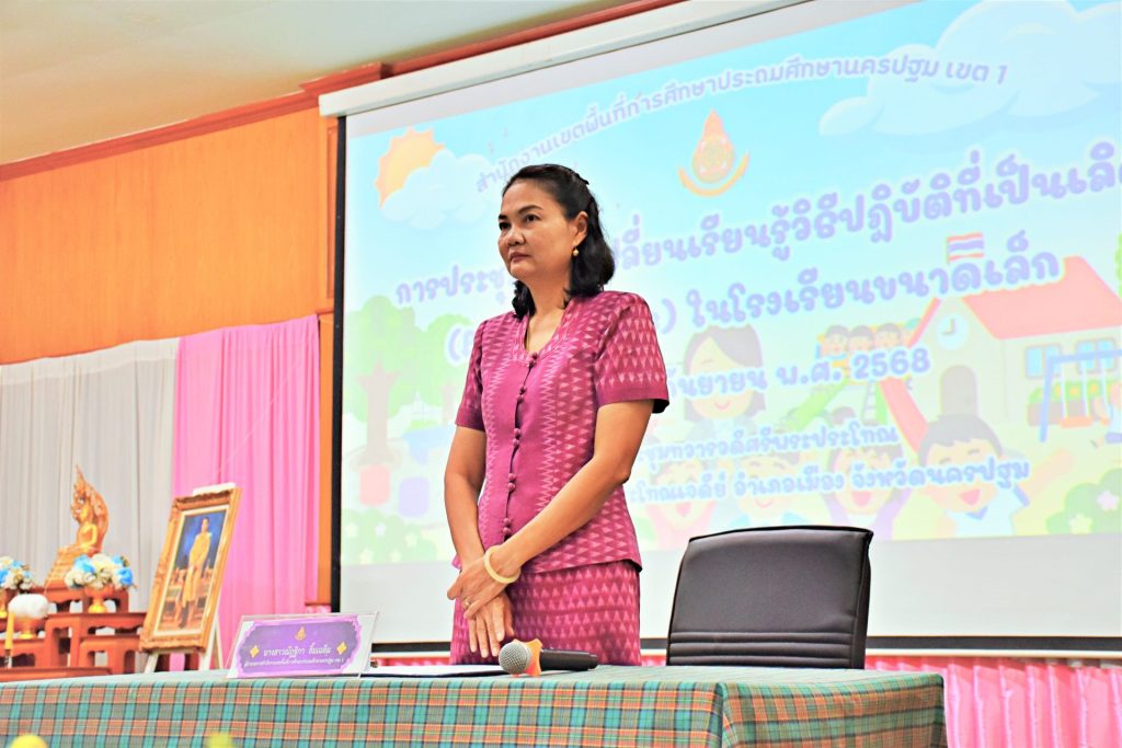 วันศุกร์ที่ 19 กันยายน 2568 เวลา 09.30 น. ดร.ณัฎฐิกา ลิ้มเฉลิม ผู้อำนวยการสำนักงานเขตพื้นที่การศึกษาประถมศึกษานครปฐม เขต 1 เป็นประธานพิธีเปิดการประชุมแลกเปลี่ยนเรียนรู้วิธีปฏิบัติที่เป็นเลิศ (Best Practice) ในโรงเรียนขนาดเล็ก สังกัด สพป.นครปฐม เขต 1 พร้อมด้วย ดร.ฐาปณี พวงงาม รองผู้อำนวยการสำนักงานเขตพื้นที่การศึกษาประถมศึกษานครปฐม เขต 1 นางสาวสุกฤตภัทร ใจรื่น ผู้อำนวยการกลุ่มส่งเสริมการจัดการศึกษา นางจรรยาพร ยอดแก้ว ผู้อำนวยการกลุ่มนิเทศติดตามและประเมินผลการจัดการศึกษา คณะศึกษานิเทศก์ และบุคลากรกลุ่มนโยบายและแผน สพป.นครปฐม เขต 1 เข้าร่วมพิธีเปิดฯในครั้งนี้ โดยมี นางสาวอุษา ใหญ่ไล้บาง ผู้อำนวยการกลุ่มนโยบายและแผน กล่าวรายงาน ในนามผู้ดำเนินการจัดประชุมฯ มีวัตถุประสงค์เพื่อแลกเปลี่ยนเรียนรู้วิธีปฏิบัติที่เป็นเลิศ (Best Practice) ในโรงเรียนขนาดเล็ก สร้างแรงบันดาลใจและยกระดับคุณภาพการจัดการศึกษาในโรงเรียนขนาดเล็ก ส่งเสริมให้ผู้บริหาร ครู และบุคลากรทางการศึกษาได้แลกเปลี่ยนเรียนรู้ร่วมกัน รวมทั้งเผยแพร่และขยายผลวิธีปฏิบัติที่เป็นเลิศ (Best Practice) แก่โรงเรียนอื่น การประชุมครั้งนี้ผู้เข้าประชุมประกอบด้วย ผู้อำนวยการโรงเรียนขนาดเล็กหรือรักษาการ จำนวน 1 คน ครูระดับปฐมวัยหรือครูระดับ การศึกษาขั้นพื้นฐาน จำนวน 1 คน รวมโรงเรียนละ 2 คน จำนวน 49 โรงเรียน ตลอดจนคณะกรรมการที่เกี่ยวข้อง รวมทั้งสิ้น 135 คน ณ หอประชุมทวารวดีศรีพระประโทณ โรงเรียนวัดพระประโทณเจดีย์ อำเภอเมืองนครปฐม จังหวัดนครปฐม